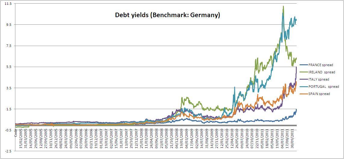 (3) Si considerano gli spread giornalieri, dal 1 gennaio 2010 al 11 novembre 2011 dei seguenti paesi: Austria, Belgio, Francia, Germania, Grecia, Irelanda, Italia, Olanda, Portogallo, Spagna